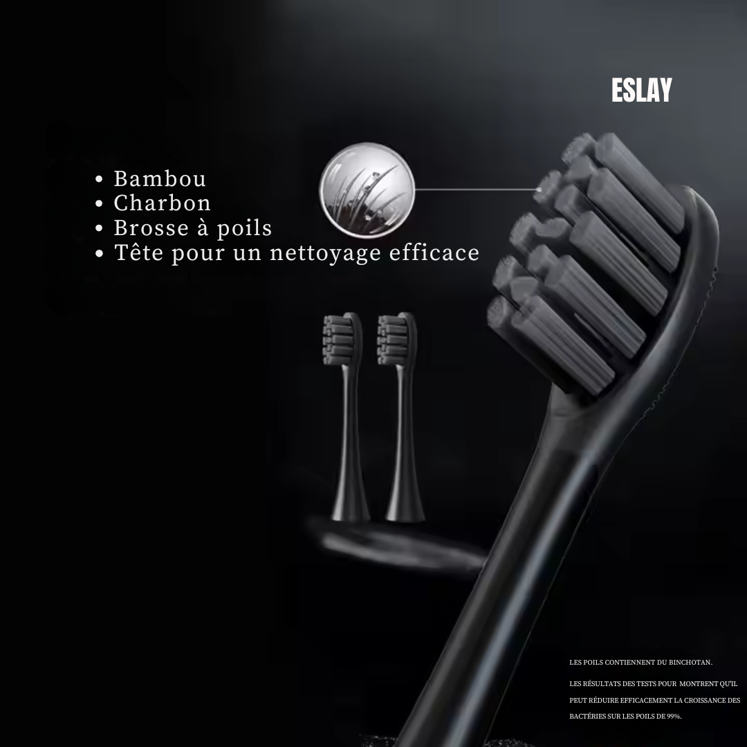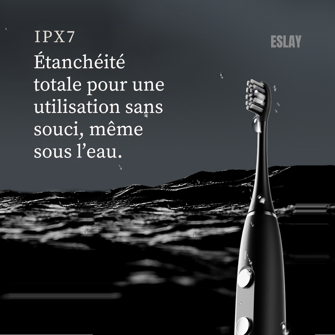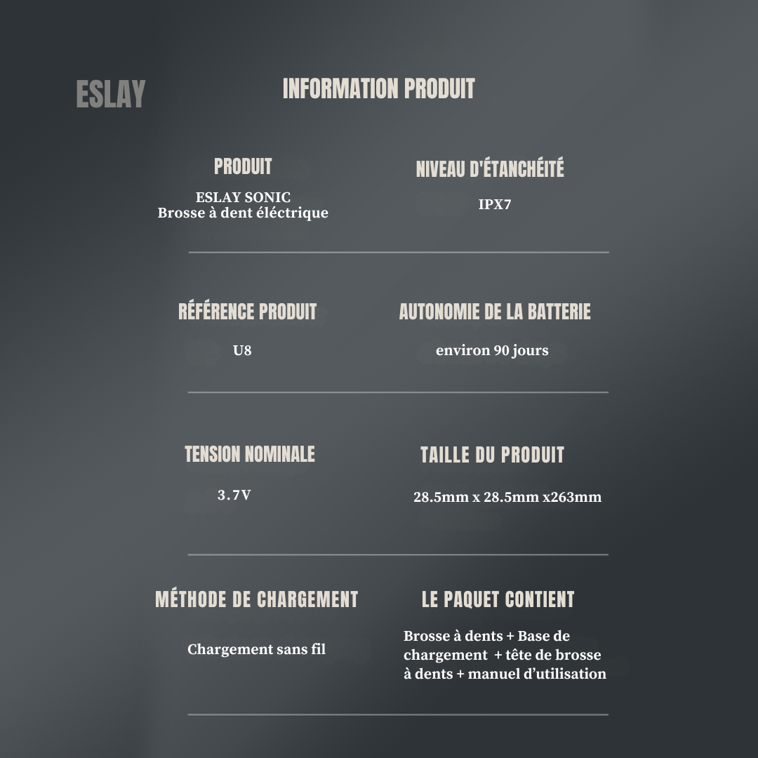 Avec une autonomie jusqu’à 90 jours, un étui de voyage inclus et une garantie 1 an, la brosse à dents sonique ESLAY est idéale à la maison comme en déplacement, pour un sourire plus sain au quotidien.