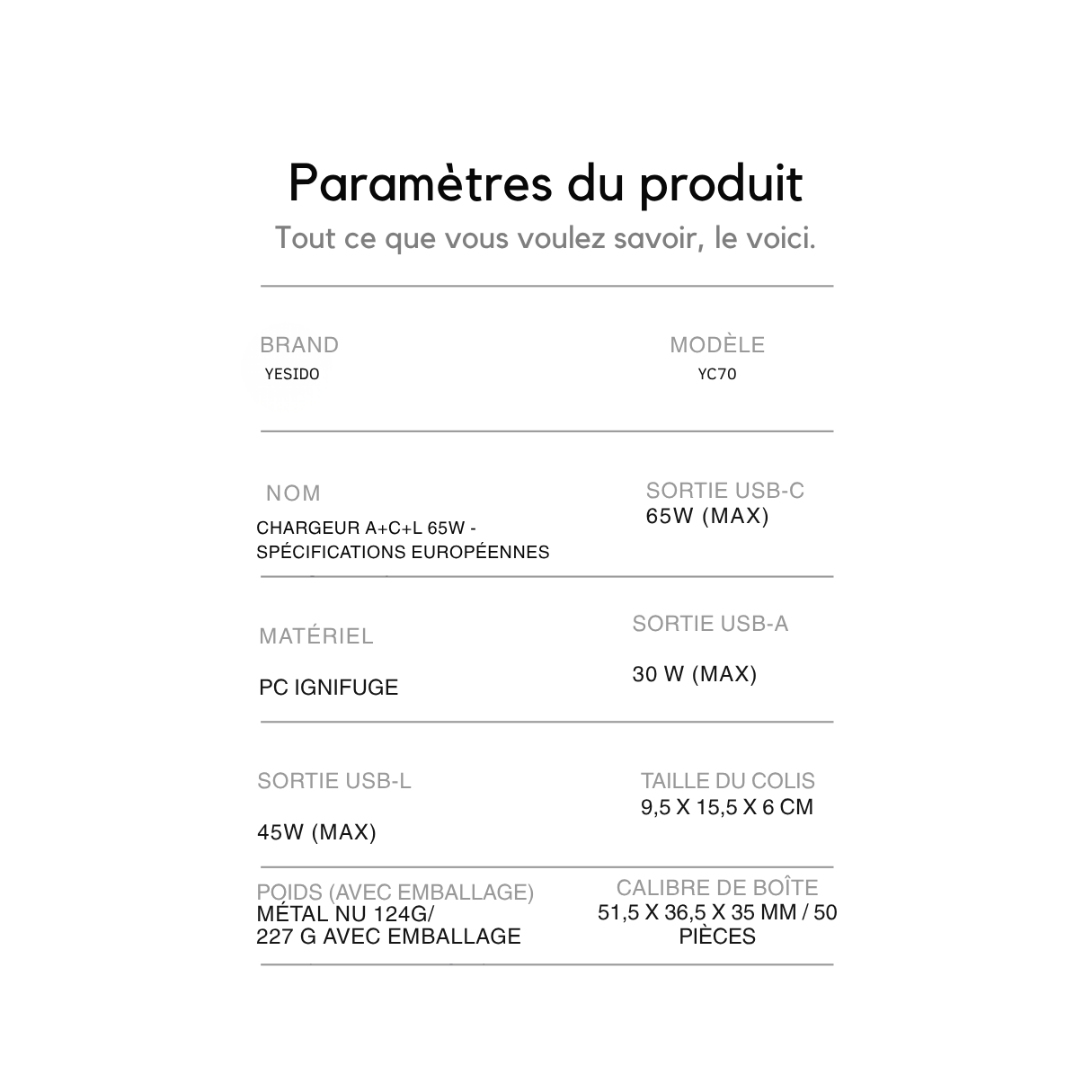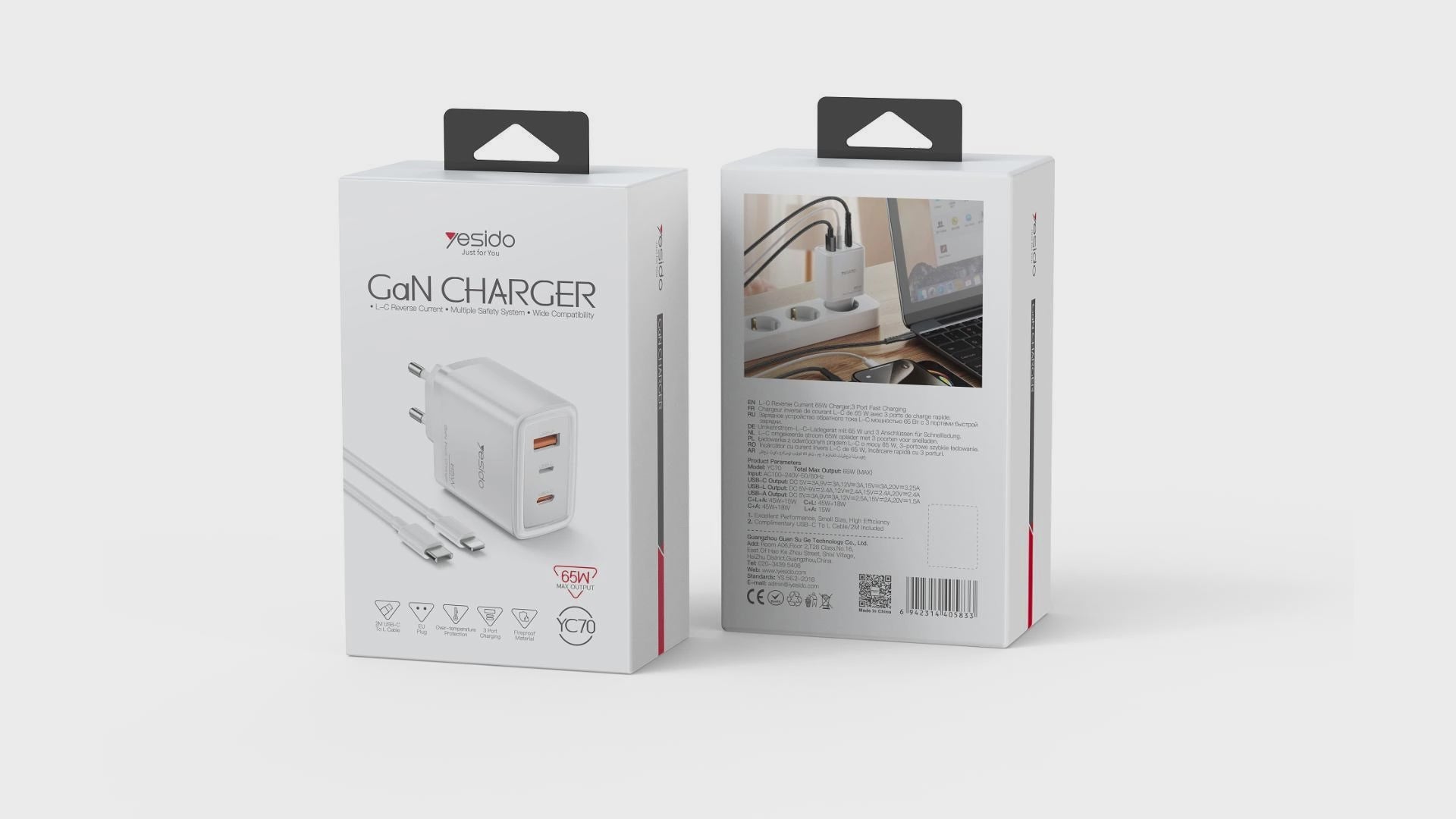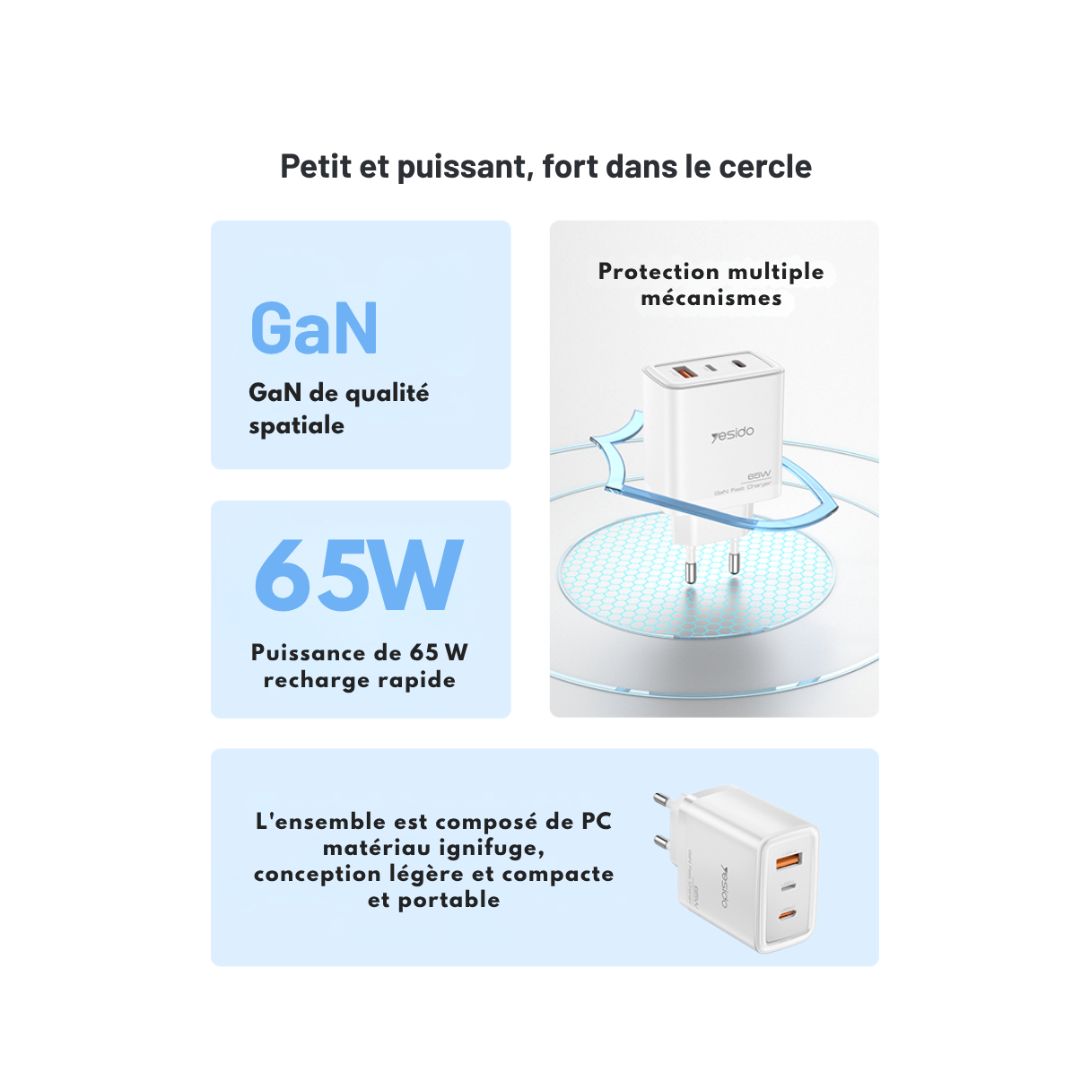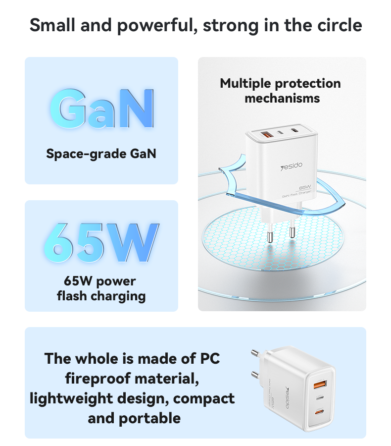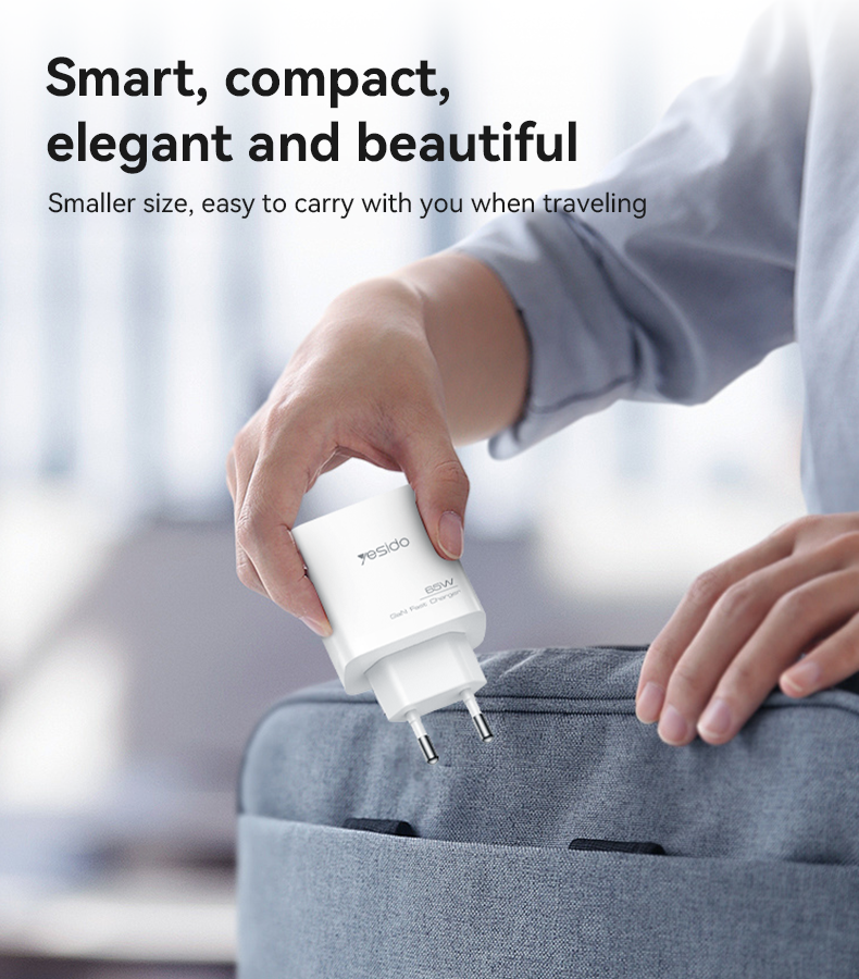 La technologie GaN (nitrure de gallium) permet de réduire la taille du chargeur tout en augmentant son efficacité énergétique. Le YESIDO 65W est capable de délivrer une puissance stable pour charger un MacBook, un iPhone, un iPad ou encore des écouteurs sans fil, le tout avec un seul bloc.
