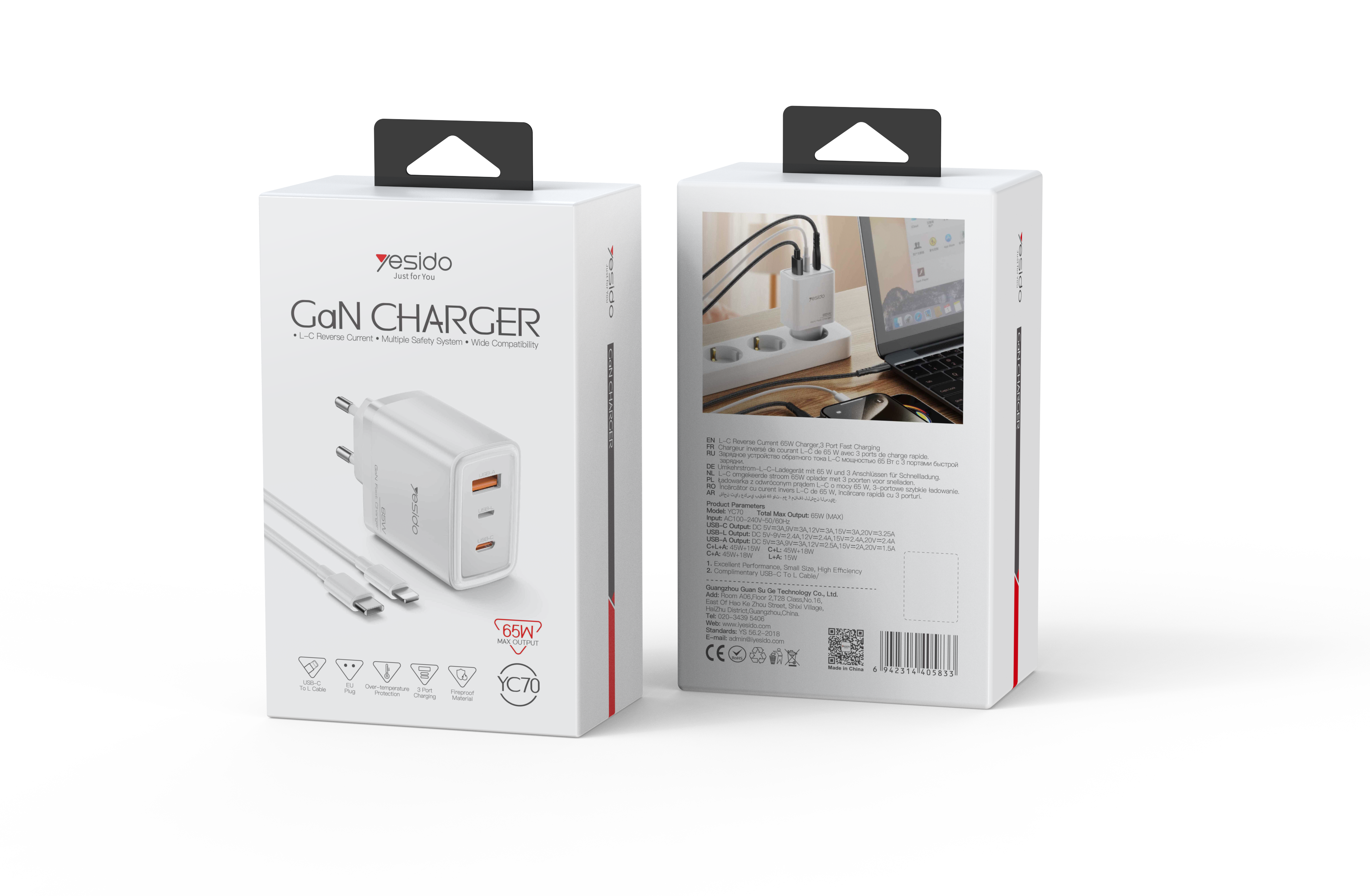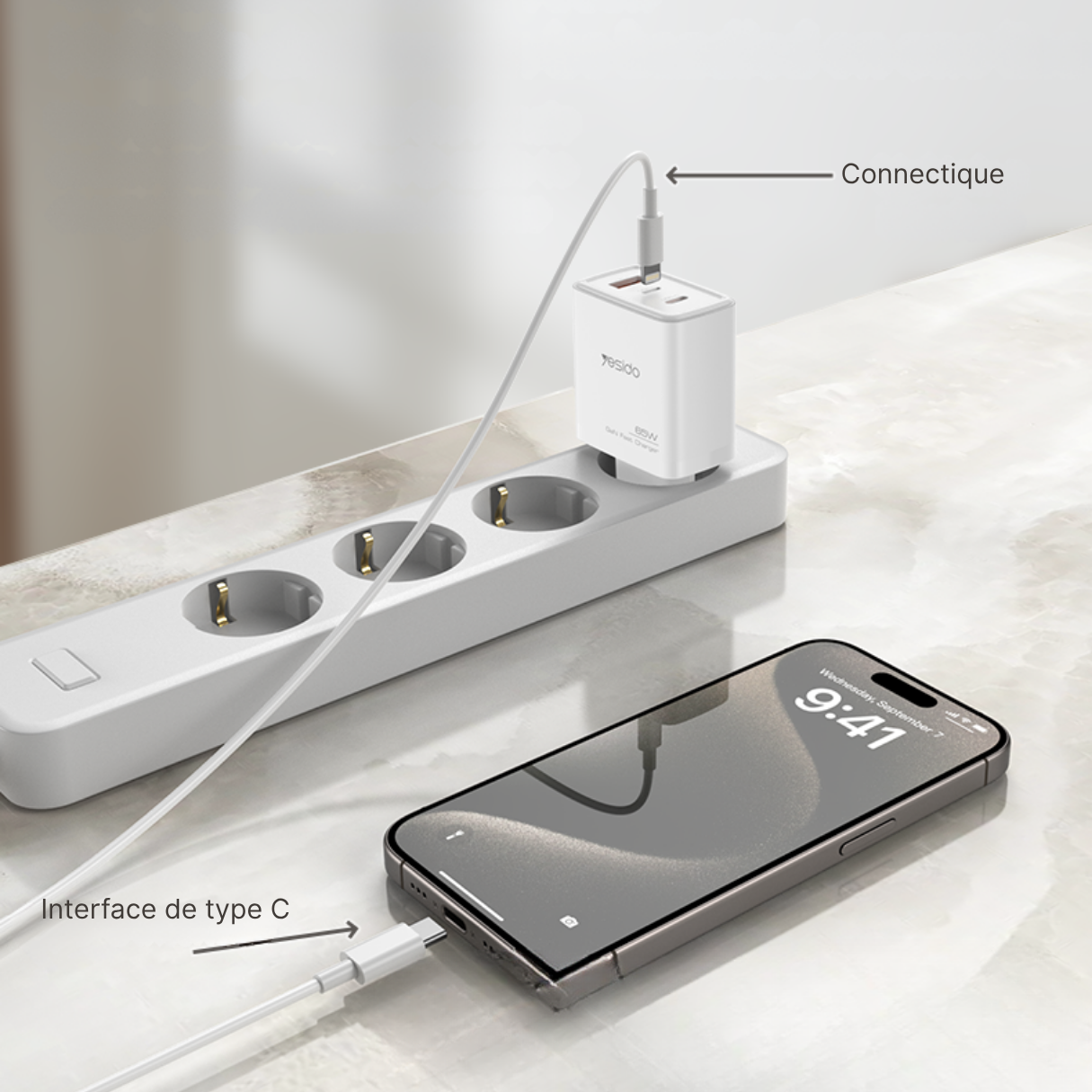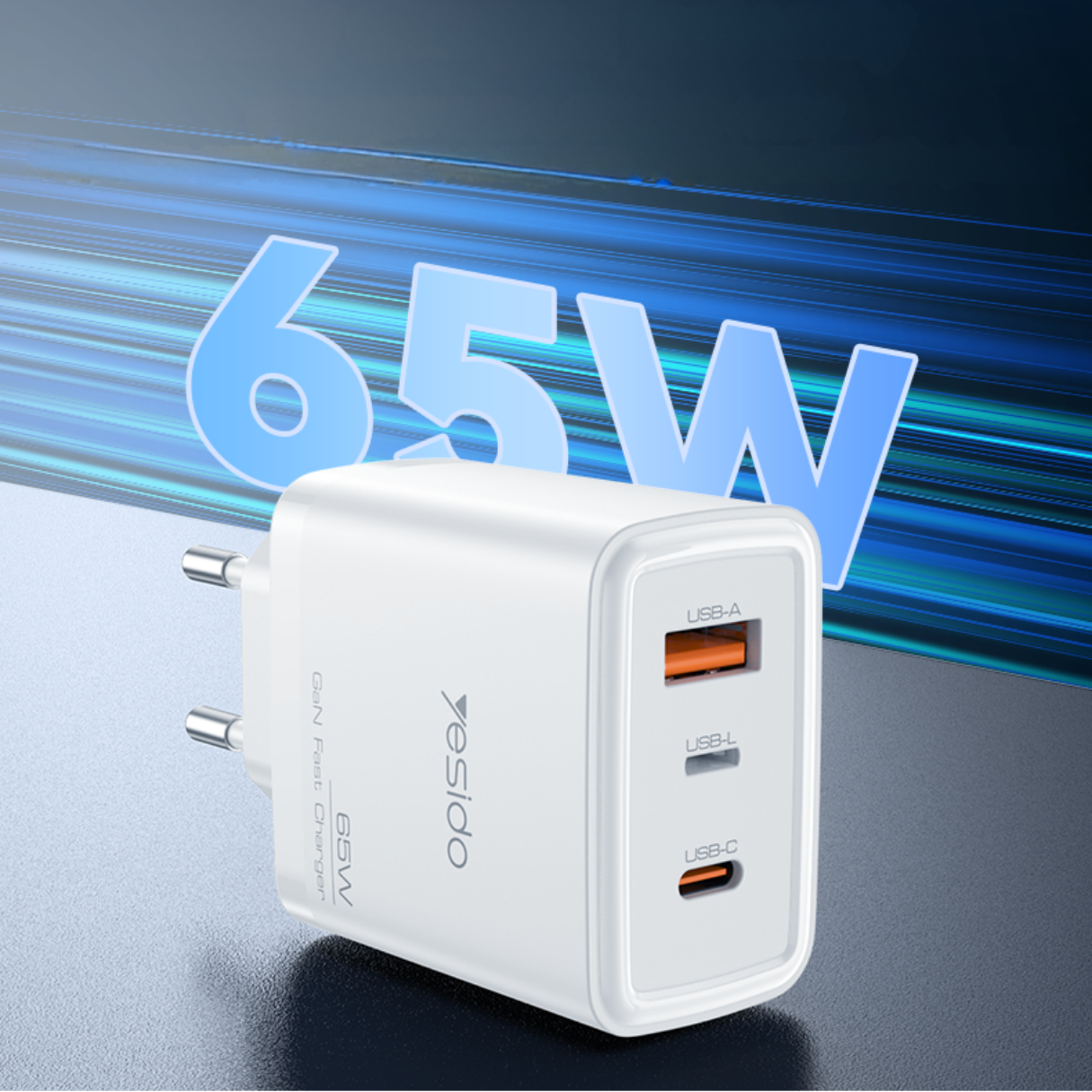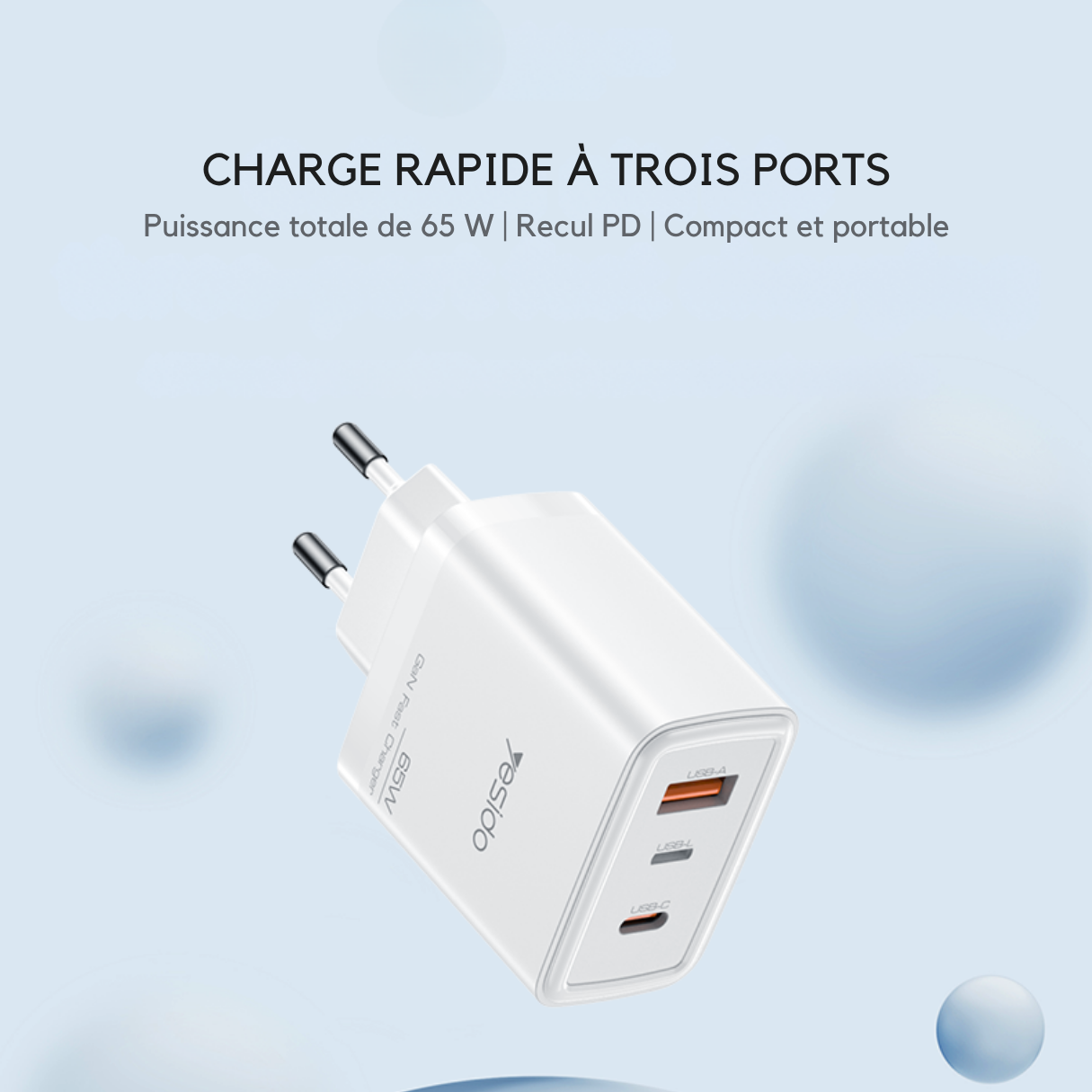 Le chargeur YESIDO 65W GaN est conçu pour simplifier la recharge multi-appareils, tout en garantissant une puissance optimale, une chauffe minimale, et un format compact. Grâce à ses trois ports – USB-A, USB-C et Lightning – il permet de recharger simultanément un smartphone, une tablette et un accessoire Apple, avec une charge rapide et intelligente pour chaque appareil.