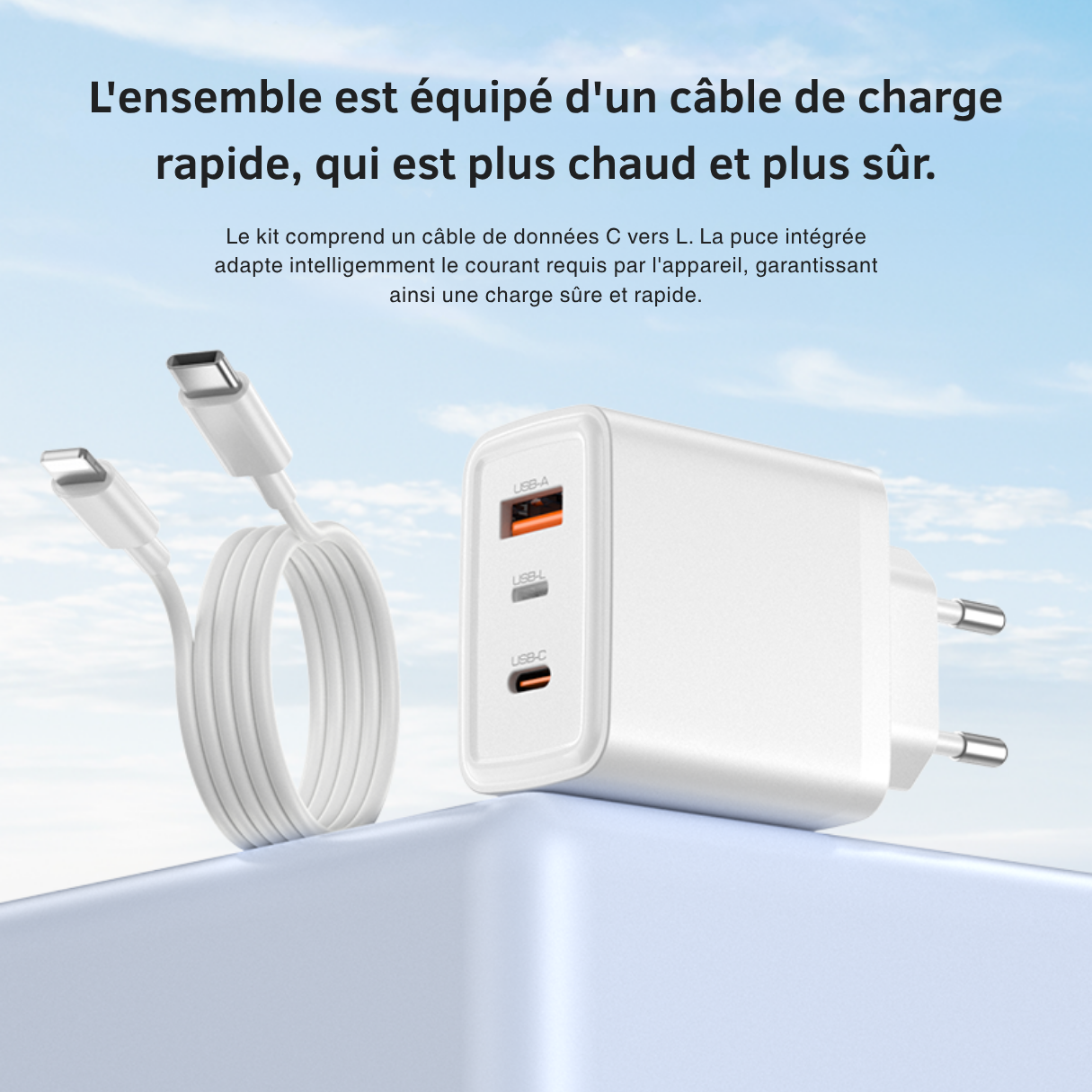 Livré avec un câble USB-C vers Lightning, il est prêt à l'emploi dès la sortie de l'emballage. La prise européenne standard le rend parfaitement adapté aux besoins des utilisateurs en France et en Europe.