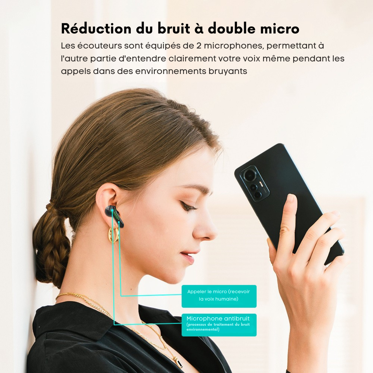 - Annulation du bruit environnemental : pour des appels et de la musique clairs dans n’importe quel environnement