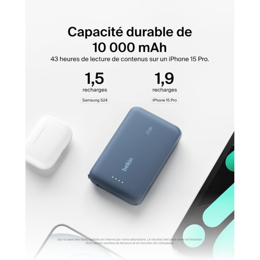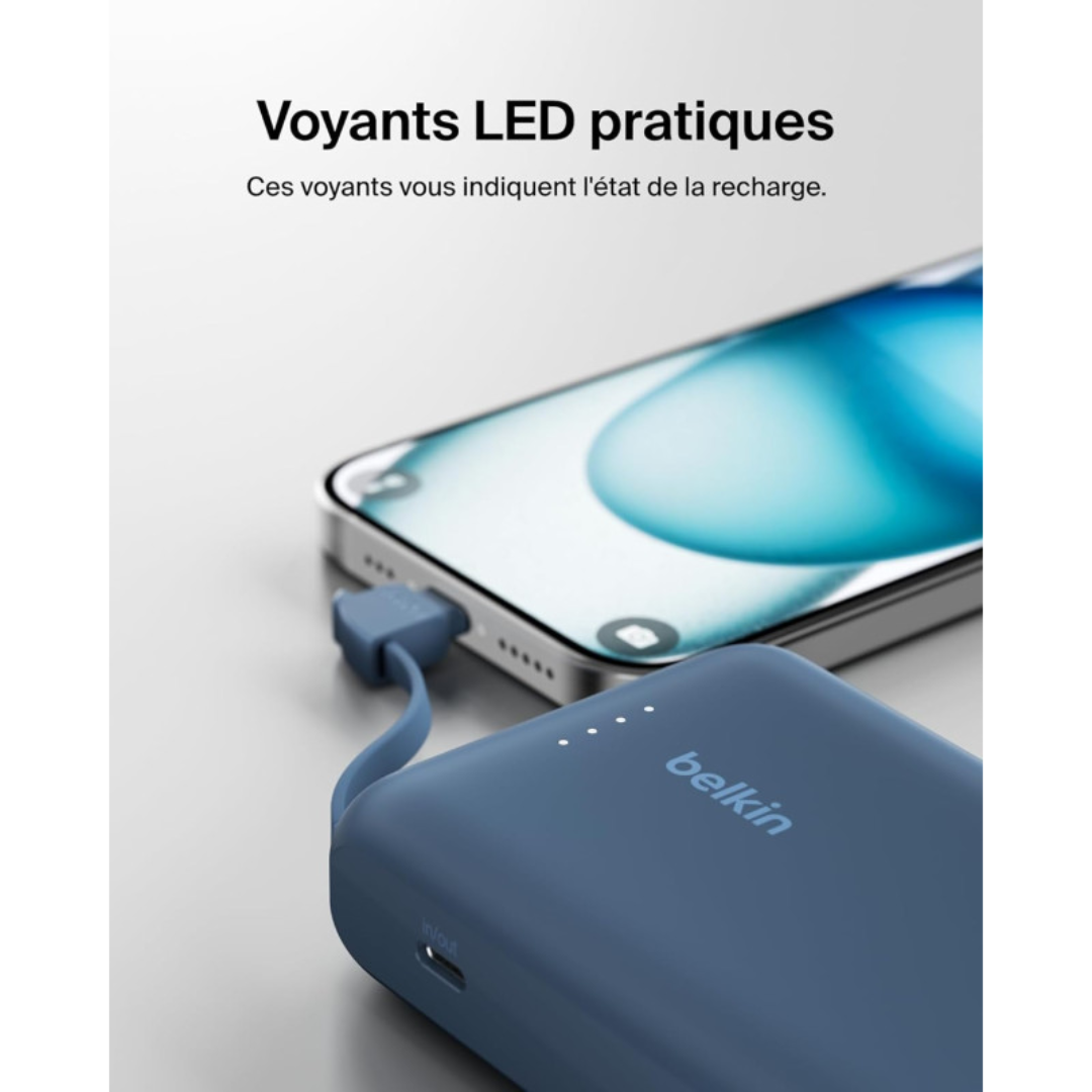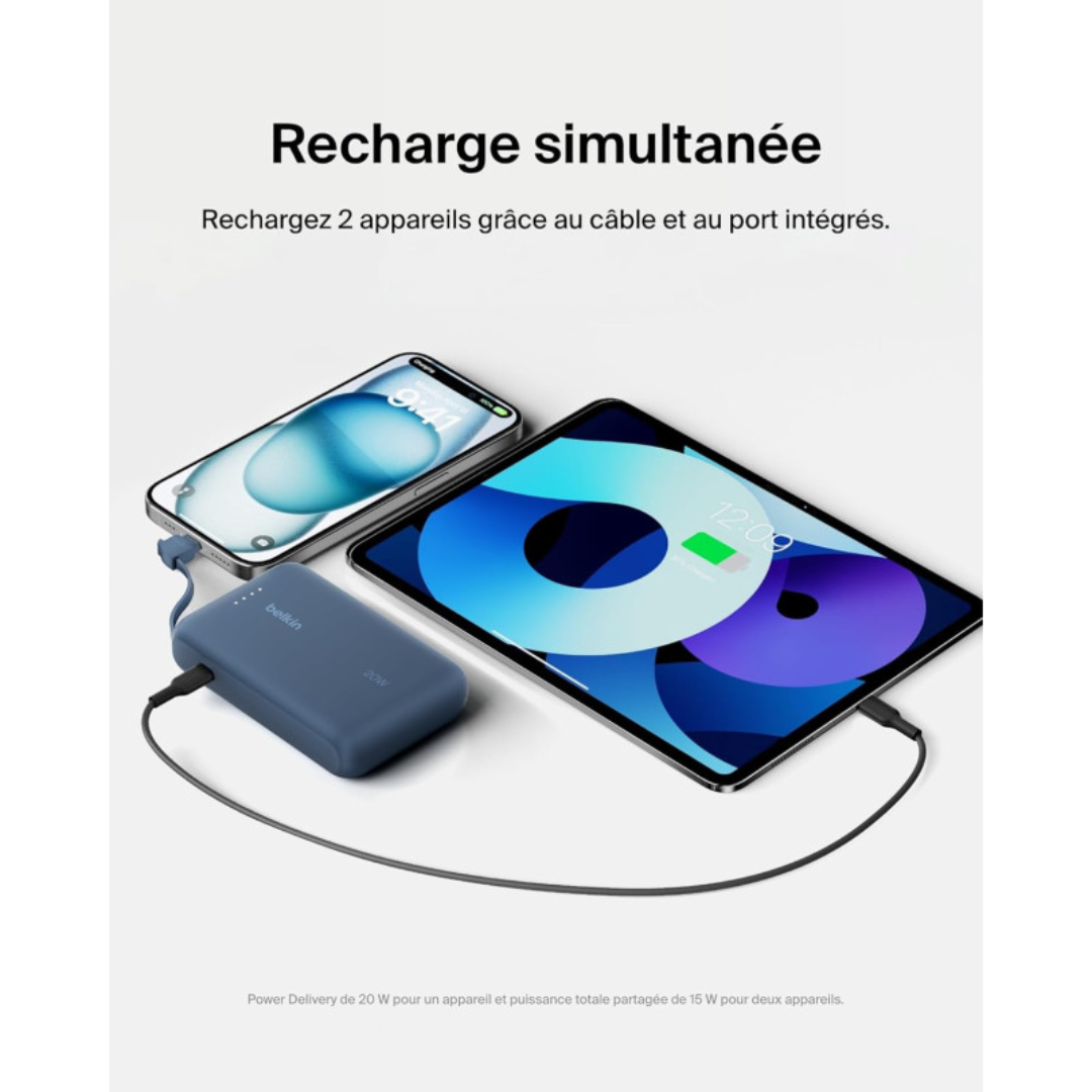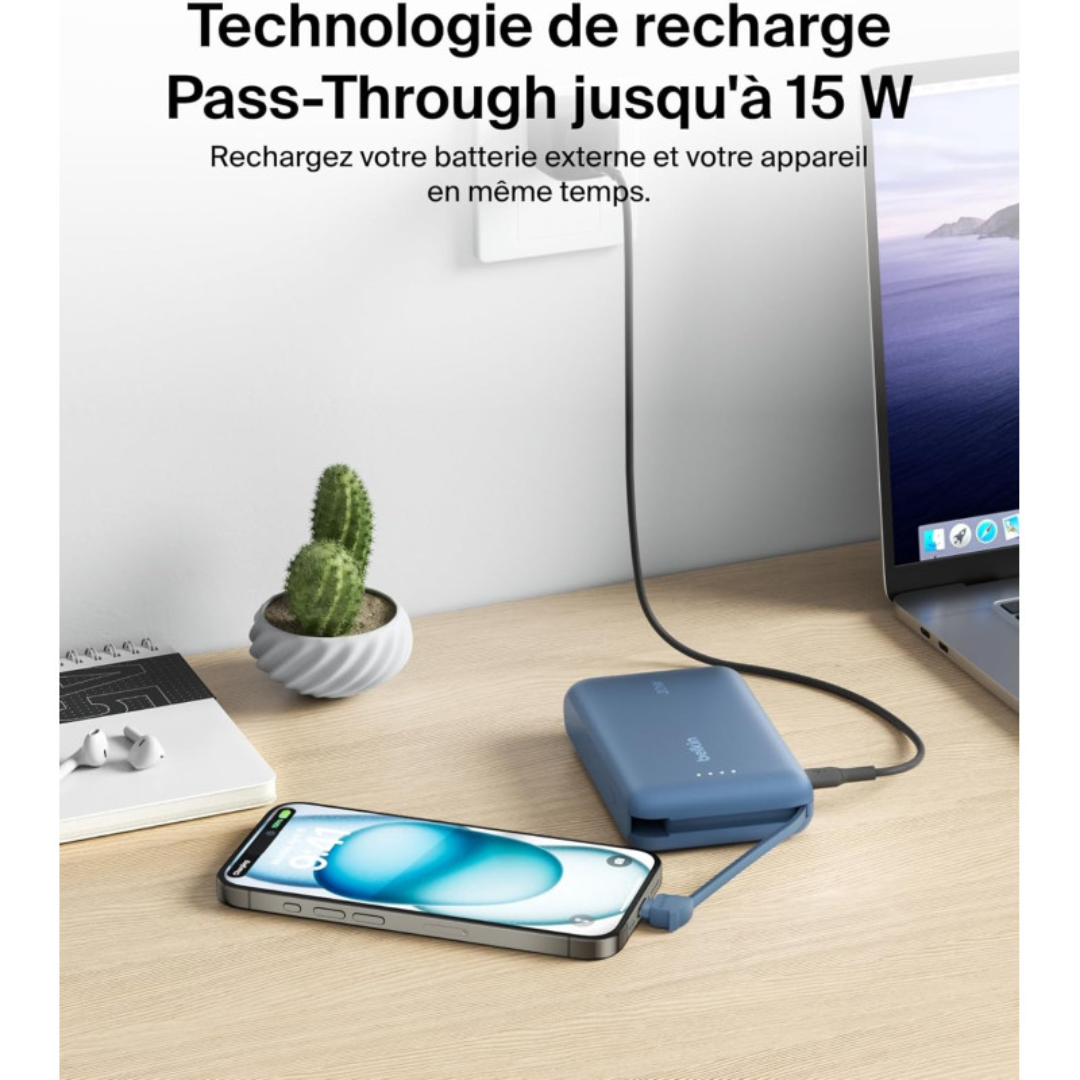 La batterie externe Belkin 10 000 mAh est conçue pour t’offrir une recharge rapide, pratique et sans contrainte au quotidien. Grâce à son câble USB-C intégré, tu n’as plus besoin d’emporter de câble supplémentaire : branche et recharge instantanément tes appareils, où que tu sois.