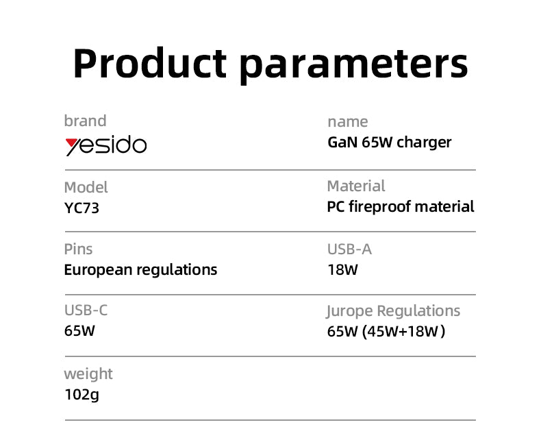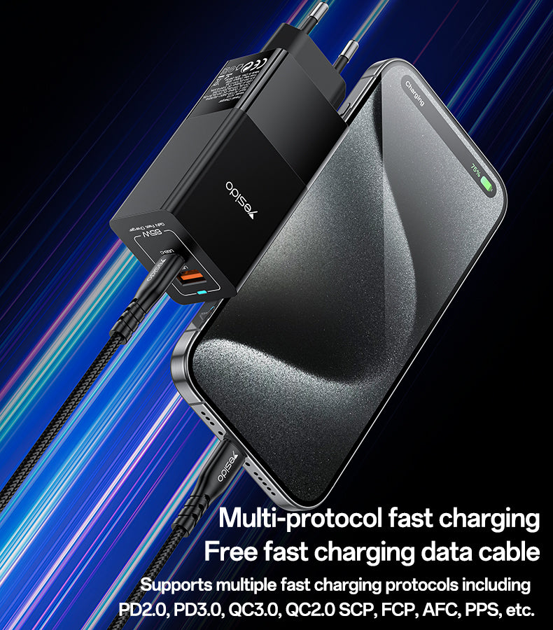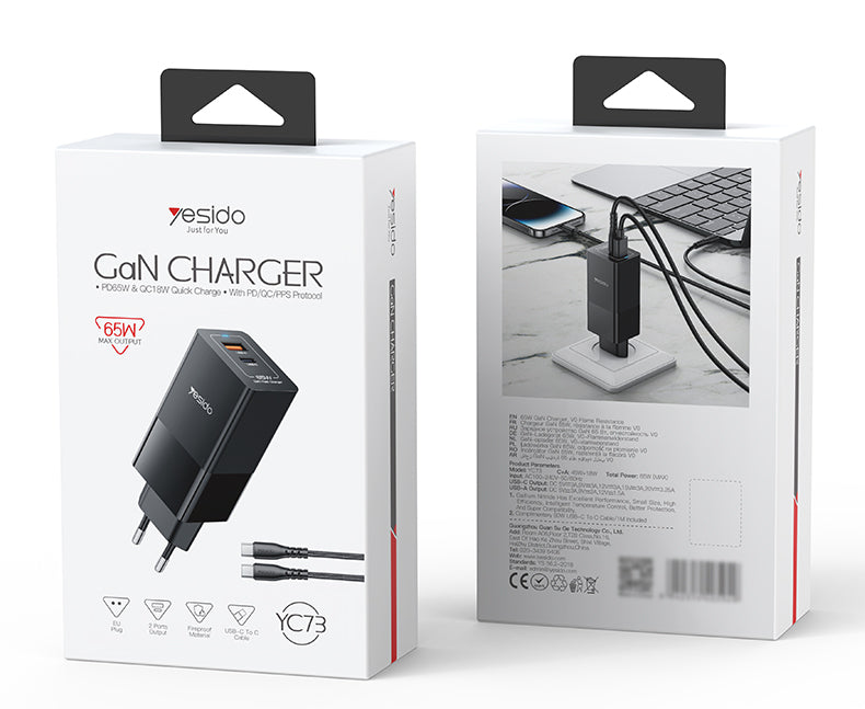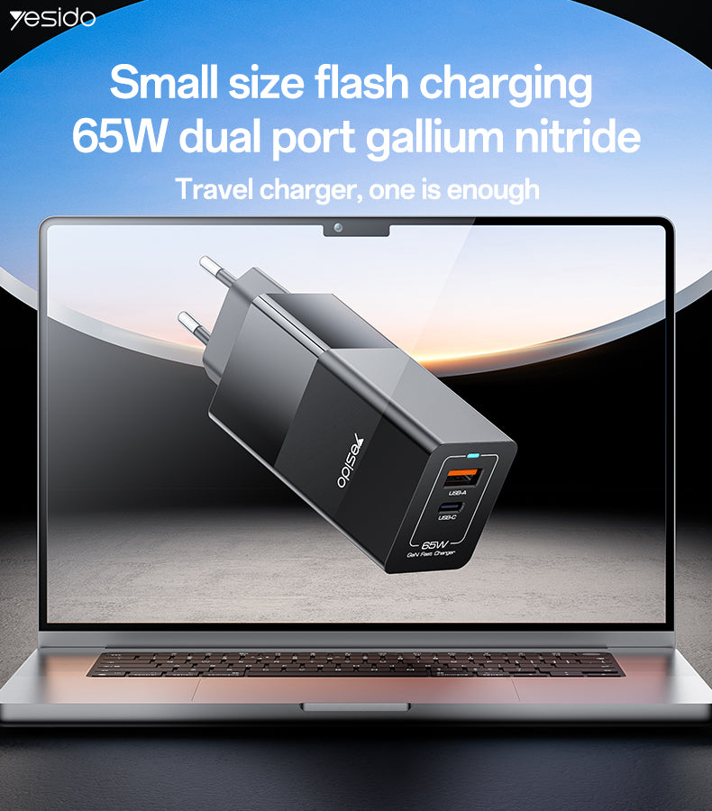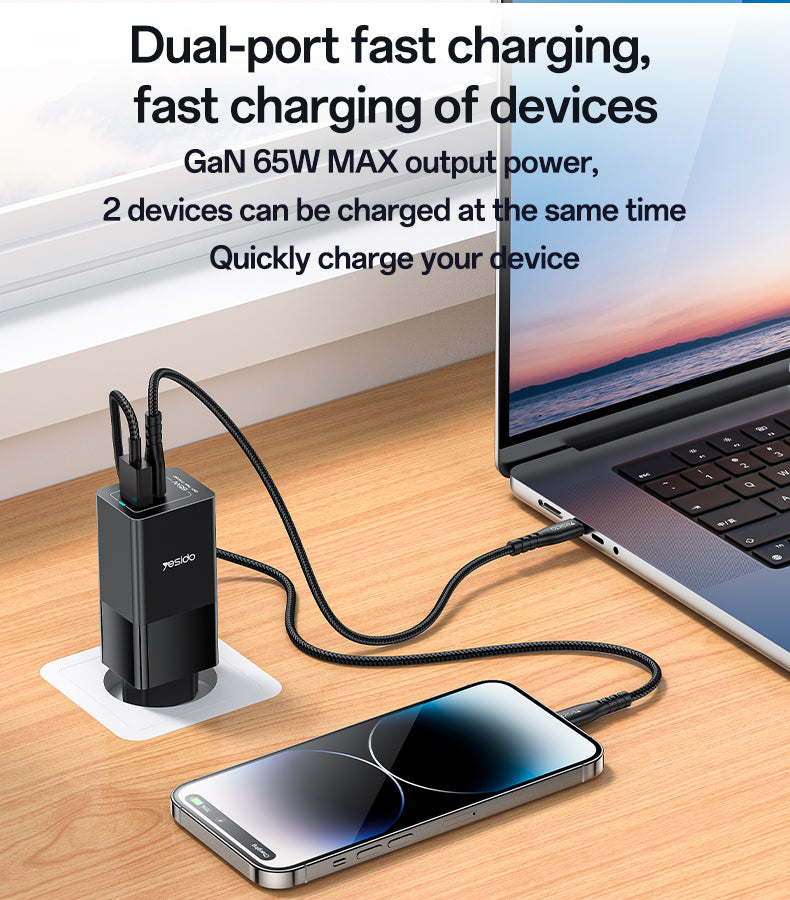 Le chargeur rapide YESIDO 65W combine performance, sécurité et design compact grâce à la technologie GaN (nitrure de gallium). Il délivre une puissance de charge rapide et stable via deux ports : USB-C Power Delivery pour les ordinateurs portables et smartphones de dernière génération, et USB-A pour les accessoires universels.