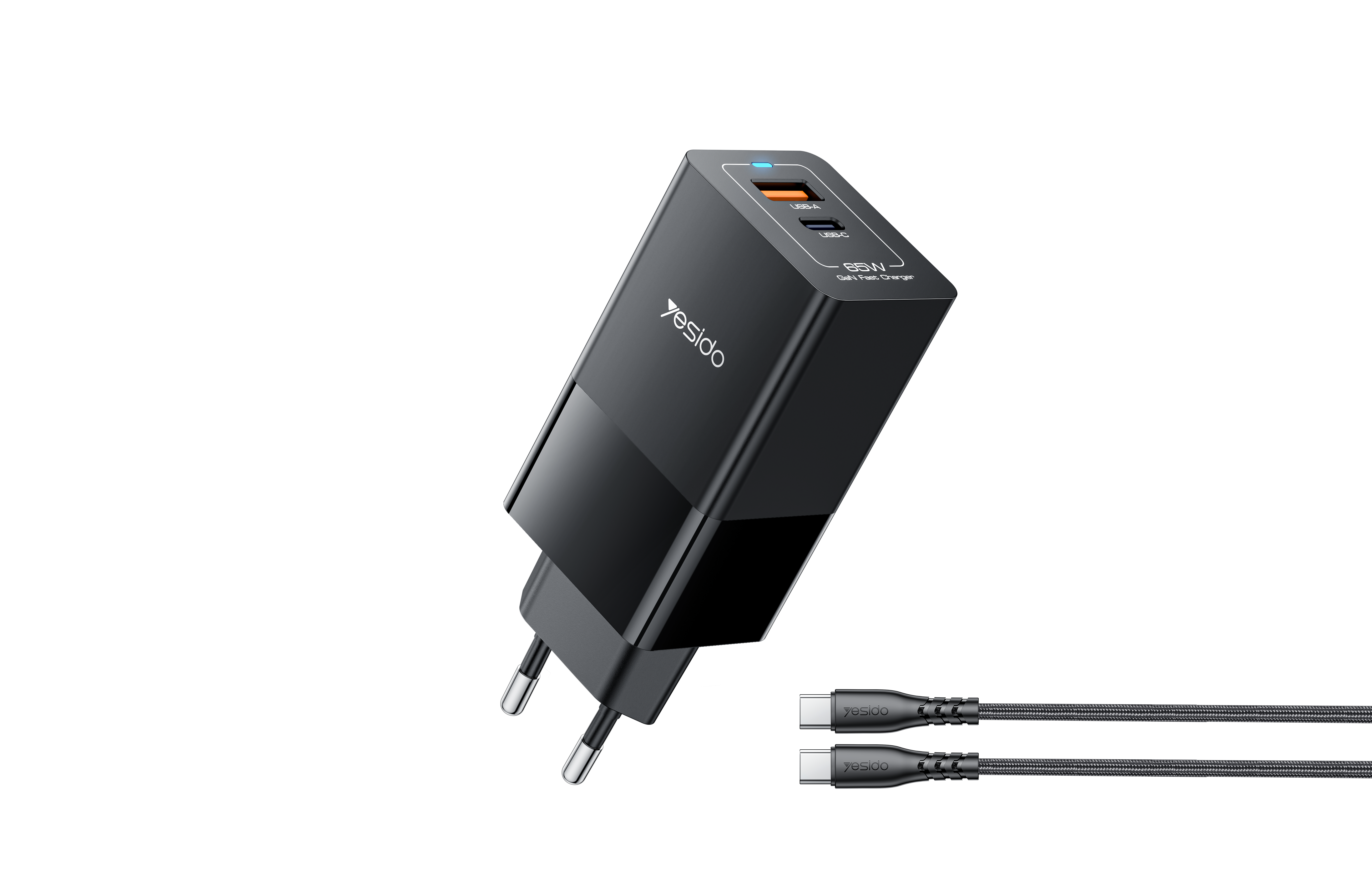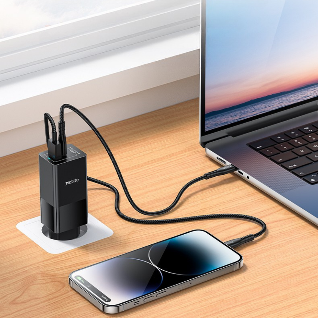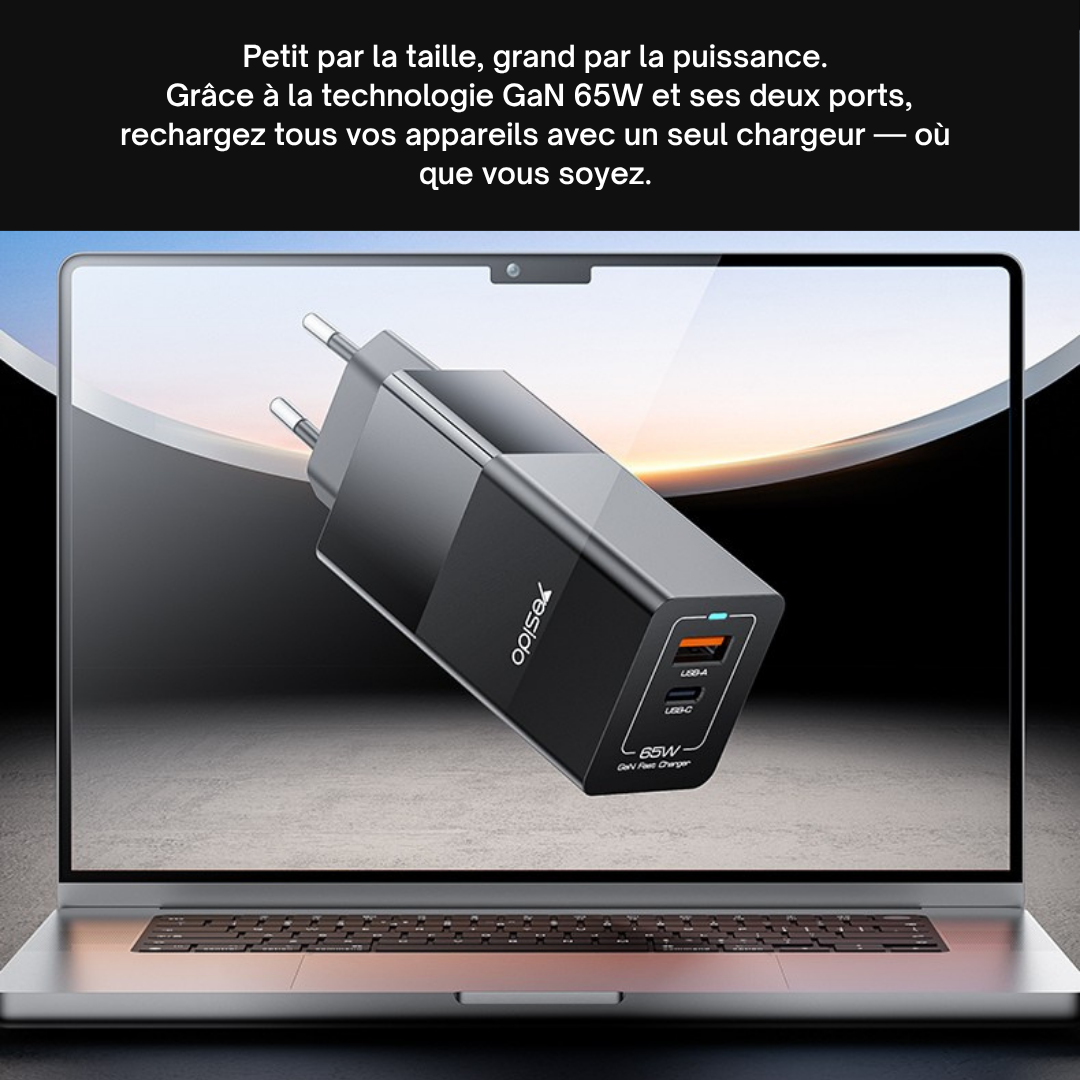 Le chargeur rapide YESIDO 65W combine performance, sécurité et design compact grâce à la technologie GaN (nitrure de gallium). Il délivre une puissance de charge rapide et stable via deux ports : USB-C Power Delivery pour les ordinateurs portables et smartphones de dernière génération et USB-A pour les accessoires universels.