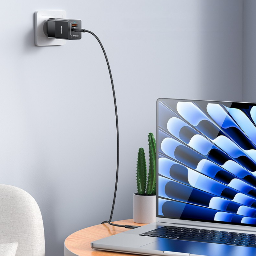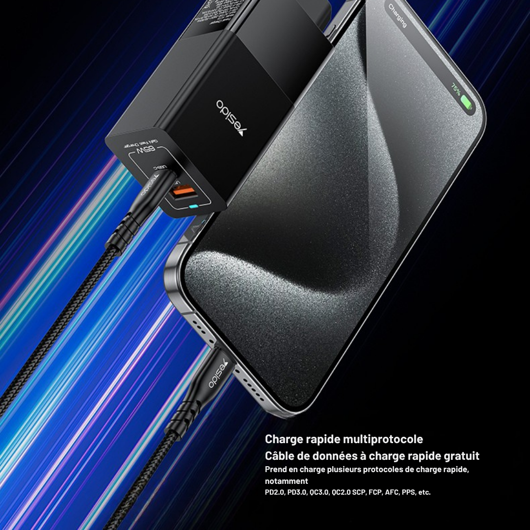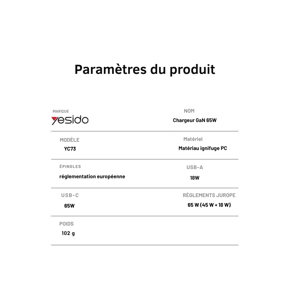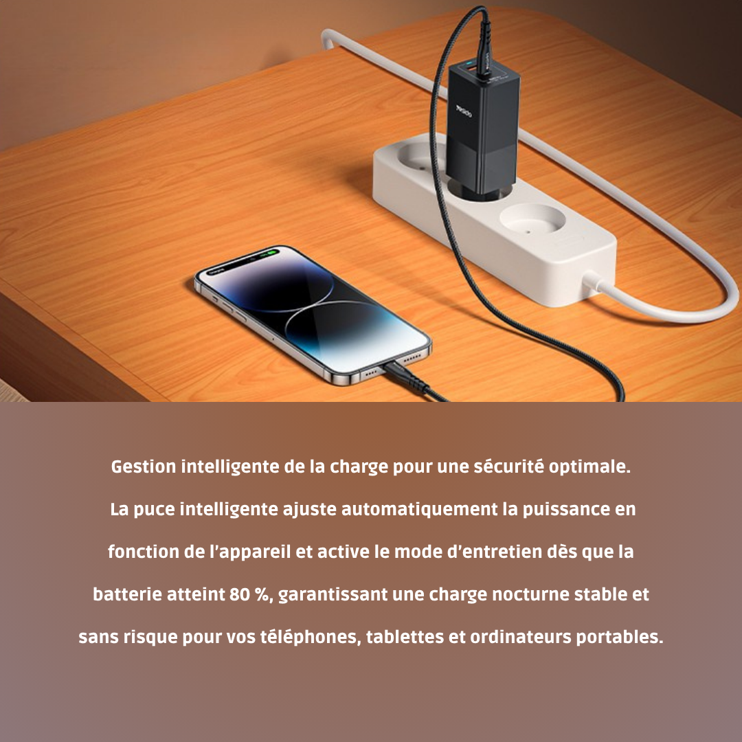 Le chargeur rapide YESIDO 65W combine performance, sécurité et design compact grâce à la technologie GaN (nitrure de gallium). Il délivre une puissance de charge rapide et stable via deux ports : USB-C Power Delivery pour les ordinateurs portables et smartphones de dernière génération et USB-A pour les accessoires universels.