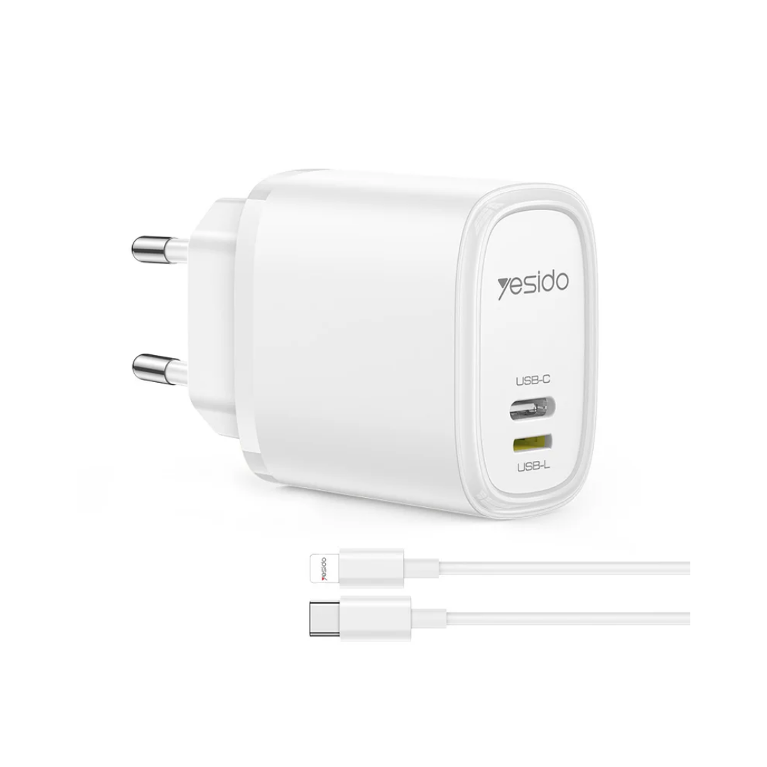 Le chargeur YESIDO YC71 est conçu pour ceux qui recherchent une solution simple, rapide et efficace pour recharger leurs appareils à la maison comme en voyage. Il intègre deux ports de sortie (USB-C et USB-Lightning), vous permettant de charger deux appareils en même temps, que ce soit un iPhone, un iPad, ou d’autres accessoires.