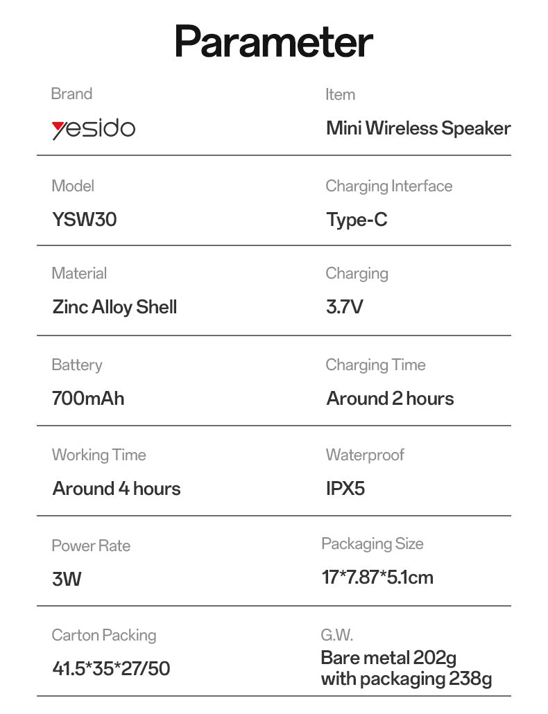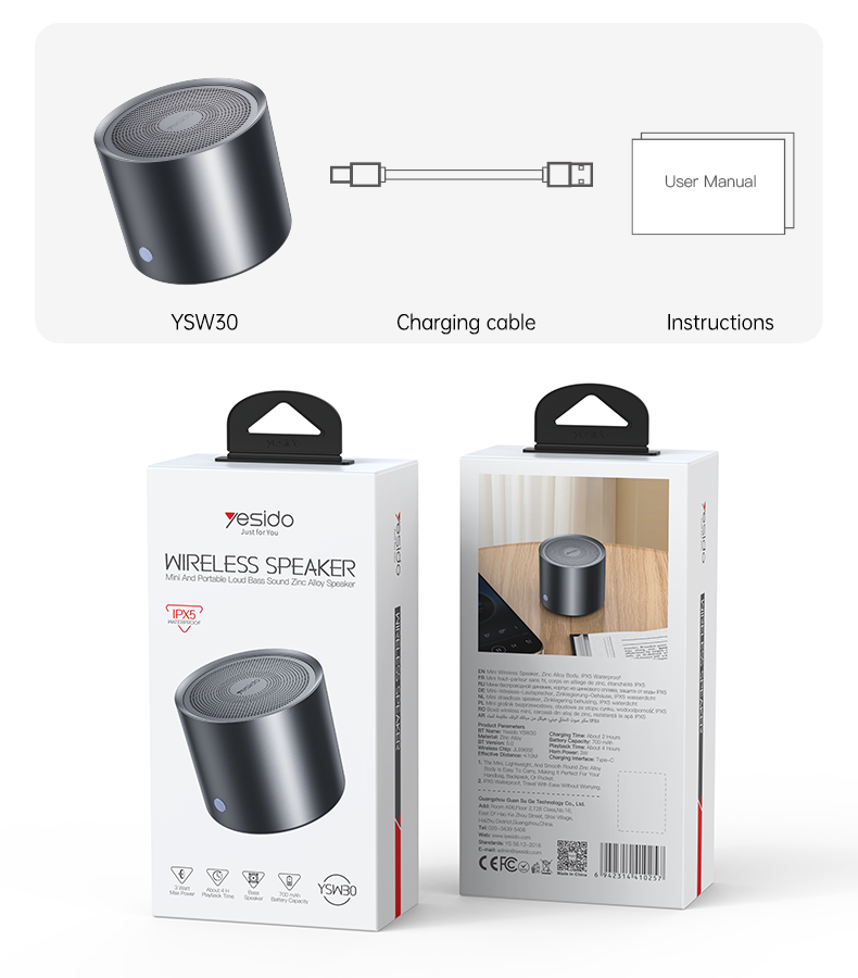 Compacte mais puissante, l’enceinte sans fil YESIDO YSW30 offre un son clair et dynamique avec ses 3W de puissance et un diaphragme de basses intégré, pour des performances étonnantes dans un format mini.