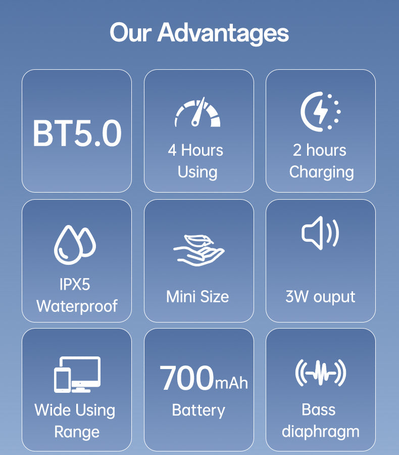Équipée du Bluetooth 5.0, elle garantit une connexion rapide, stable et sans coupure avec tous vos appareils compatibles. Grâce à sa batterie de 700mAh, vous profitez de plusieurs heures de musique non-stop, que ce soit en intérieur ou en extérieur.