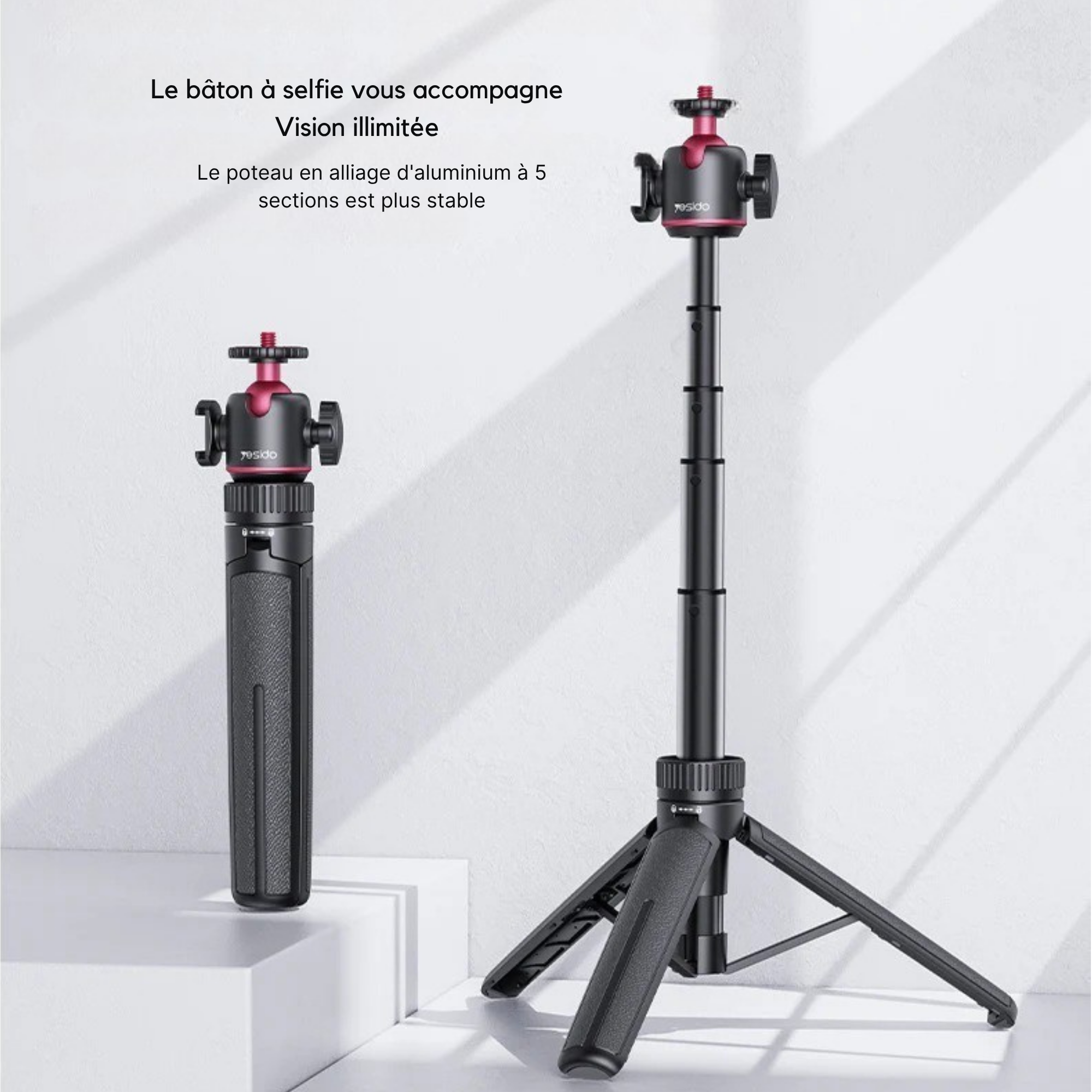 Conçu pour s’adapter à tous vos appareils (smartphone, appareil photo, webcam, vidéoprojecteur léger), il dispose de pieds extensibles et d’une tête rotative à 360°, pour vous permettre de capturer sous tous les angles. Réglable en hauteur, il s’adapte à toutes les situations, que vous soyez assis, debout ou en déplacement.