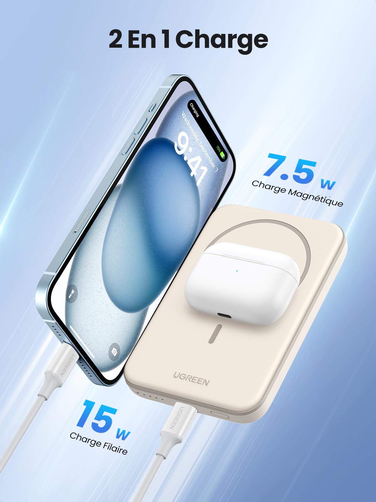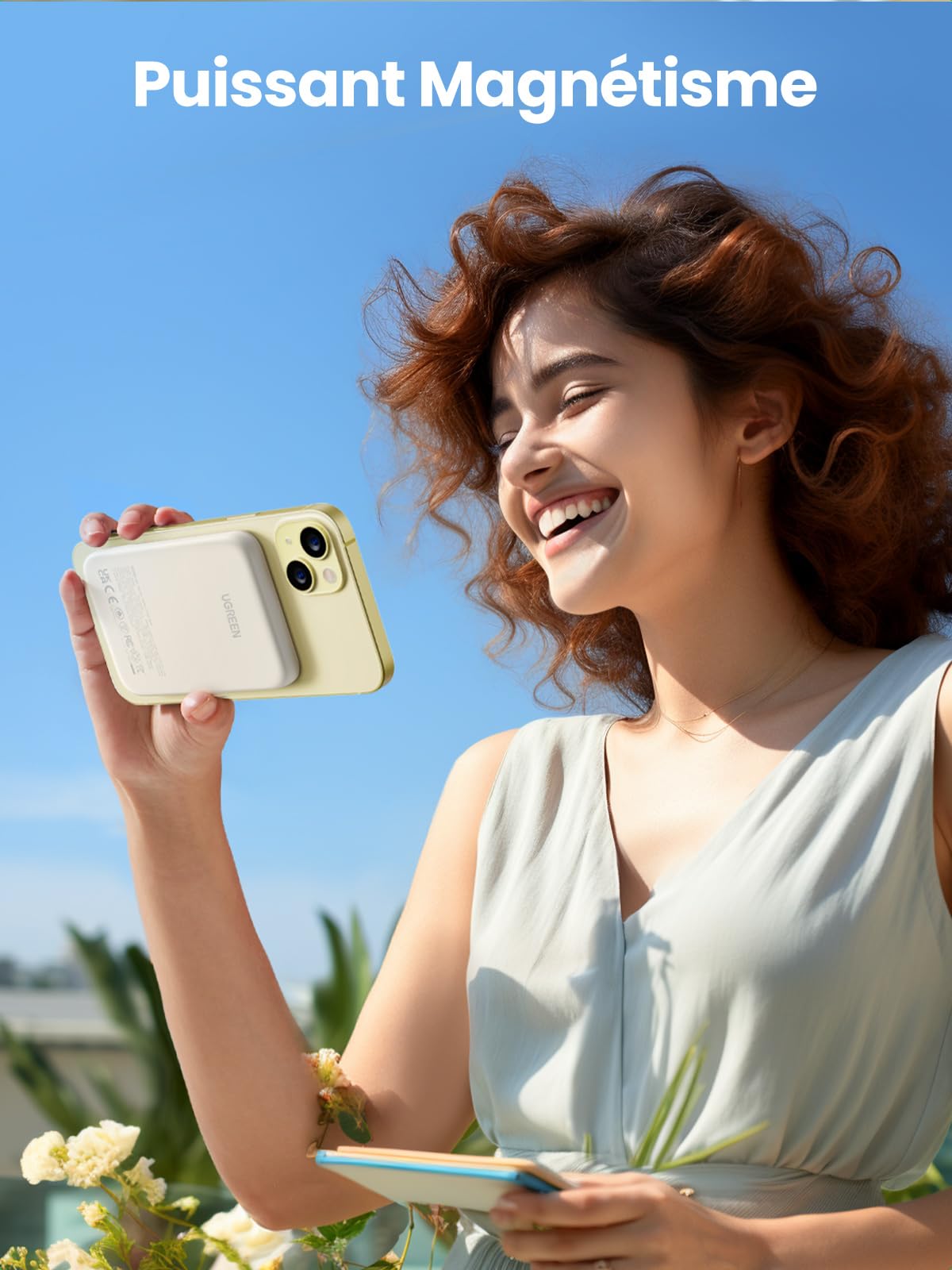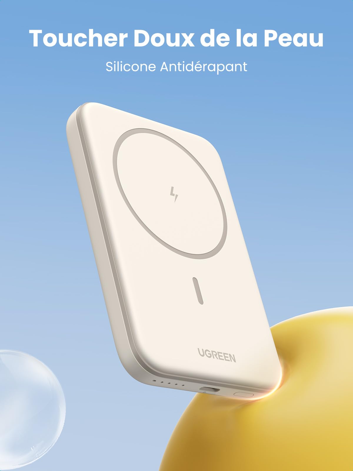 La UGREEN Batterie Externe Sans Fil Qi 5000mAh combine la charge sans fil magnétique et la compacité extrême. Compatible MagSafe et Qi, elle se fixe magnétiquement à votre iPhone ou se pose sur tout appareil compatible Qi pour une recharge instantanée.